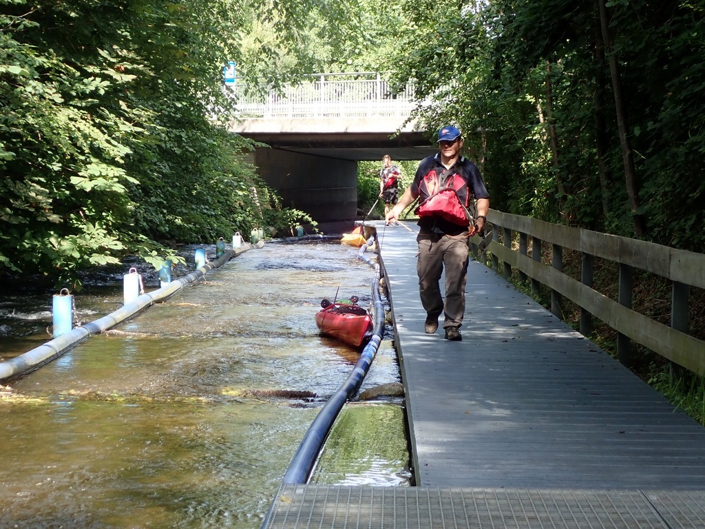 Nach dem gemeinsamen Frühstück am Montagmorgen wurden die Boote aufgeladen und zur Einsatzstelle gefahren. Nach der ersten Umtragestelle paddelten die Jugendlichen durch einen engen und bewachsenen Kanal, der in einem weiteren See mündete. Dort trafen sie auf eine Bootsrutsche, bei der sie viel Spaß beim hinunterfahren hatten. Nachdem alle am Ziel ankamen ging es mit dem Kleinbus zurück zum Campingplatz, unterwegs fing es an zu regnen. Danach fuhren alle gemeinsam einkaufen, abends sollte es nämlich Wraps geben. Nach dem Abendessen wurde die Spiele-Olympiade der Freizeit mit dem Kanujugendspiel, welches im Winterprogramm gebastelt wurde, weitergeführt.