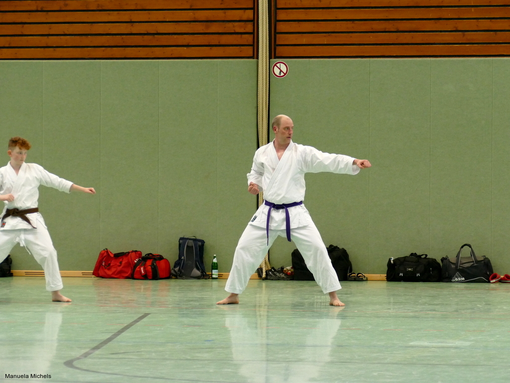 Die Teilnehmer trainierten - in Unter- und Oberstufe aufgeteilt- sowohl einzelne Karate-Techniken als auch Kombinationen aus Abwehr-Techniken und Angriffen mit Armen und Beinen. All das wurde am Partner und mit dem Partner geübt. Bei der sogenannten "Kata" (einer Art Schattenkampf) mussten sich die Karateka mehrere Angreifer vorstellen und mit schnellen und kraftvollen Techniken reagieren.