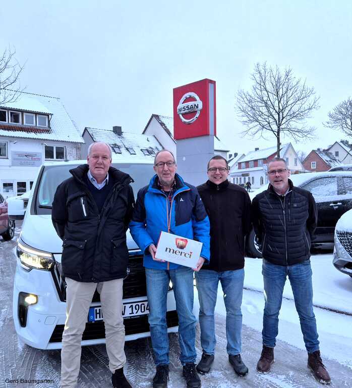 Bei dichtem Schneetreiben am vergangenen Montag konnte das neue Gefährt beim NISSAN-Autohaus Heiko Wenzel in der Verdener Straße von Andreas Bockelmann und Stefan Wagner in Empfang genommen werden.